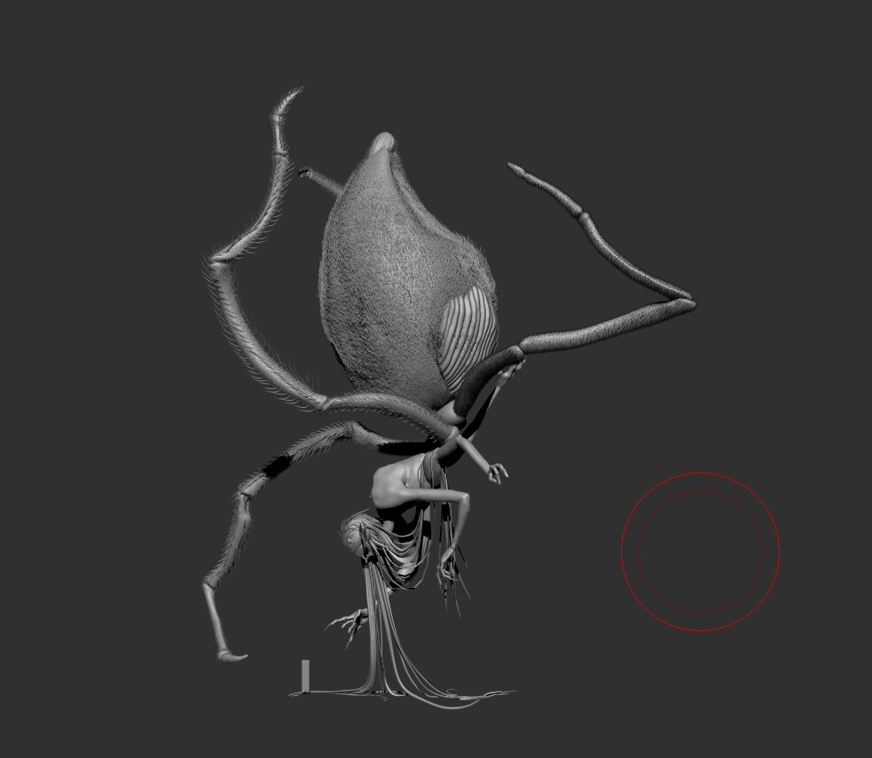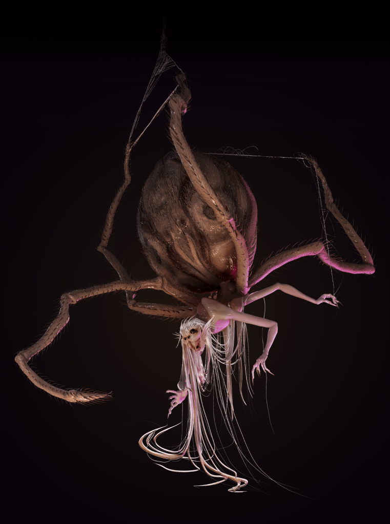 My main focus was giving her more spidery traits, and emphasizing her deceptive nature by having physical features that mimicked more human/drow-esque features, like the wisps of hair mimicking pointed ears.