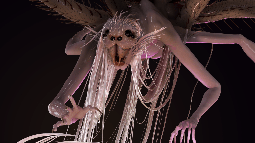 The image to the right, Final Comp (2024), was the image I originally submitted as my final. Later, I went a refreshed her a bit with a focus on making her hair and webbing look more translucent and realistic.